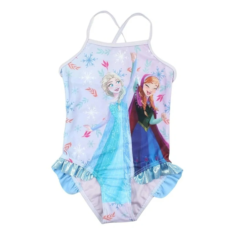 Jednodílné plavky pro holky FROZEN - Disne. Přední část plavek zdobí obrázek legendárních princezen Anny a Elsy na fialovém podkladu. Na zadní části je mírný výstřih se šňůrkami do X. Z vnitřní strany spodní části plavek je jemná bílá podšívka. Materiál plavek je poměrně elastický, takže se dobře přizpůsobí tělu a pohodlně se nosí.