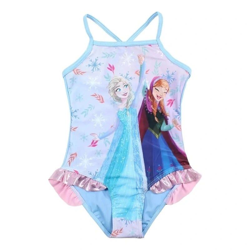 Jednodílné plavky pro holky FROZEN - Disne. Přední část plavek zdobí obrázek legendárních princezen Anny a Elsy na fialovém podkladu. Na zadní části je mírný výstřih se šňůrkami do X. Z vnitřní strany spodní části plavek je jemná bílá podšívka. Materiál plavek je poměrně elastický, takže se dobře přizpůsobí tělu a pohodlně se nosí.