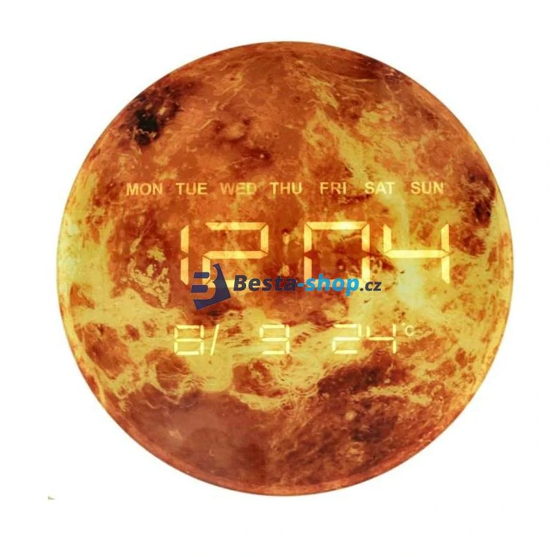 Hodiny nemusí být nudné - a tyto rozhodně vyniknou! Grafika Mars přitahuje pozornost a dělá z funkčního zařízení jedinečný doplněk interiéru. Elektronický displej poskytuje informace jako: přesný čas (12/24h), datum (M/D/Y), den v týdnu (v angličtině) a aktuální pokojovou teplotu. Jakmile jsou hodiny nastaveny, značka dne v týdnu bude nepřetržitě blikat. Lze jej zavěsit na zeď nebo umístit na přiložené stojánky. Hodiny musí být neustále připojeny ke zdroji napájení (síťový kabel je součástí dodávky). Baterie CR3023 (součástí balení) uchovává uložená data v případě dočasného výpadku napájení.